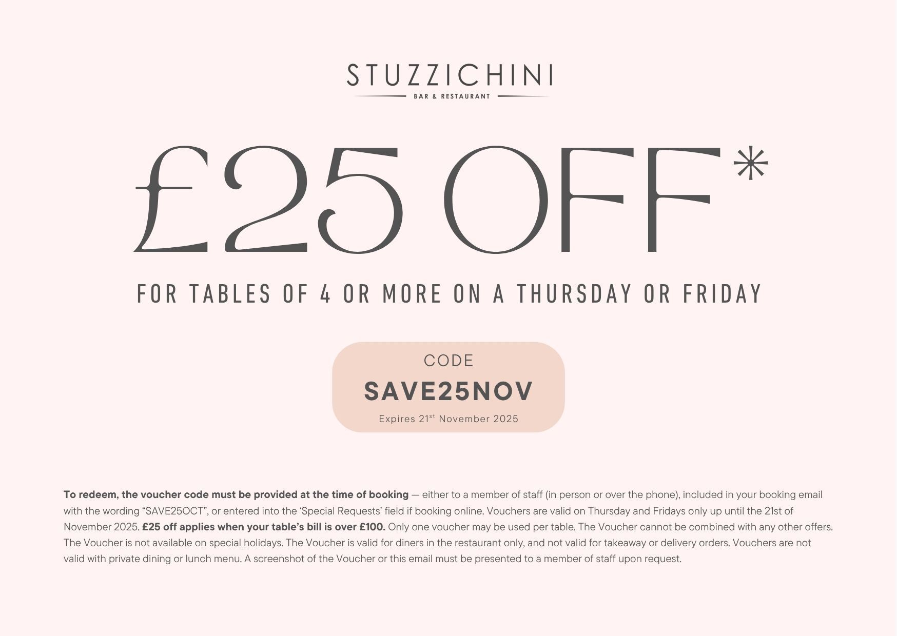 For the next few Thursdays and Fridays, until 21st November 2025, enjoy up to £25 off your table’s bill!