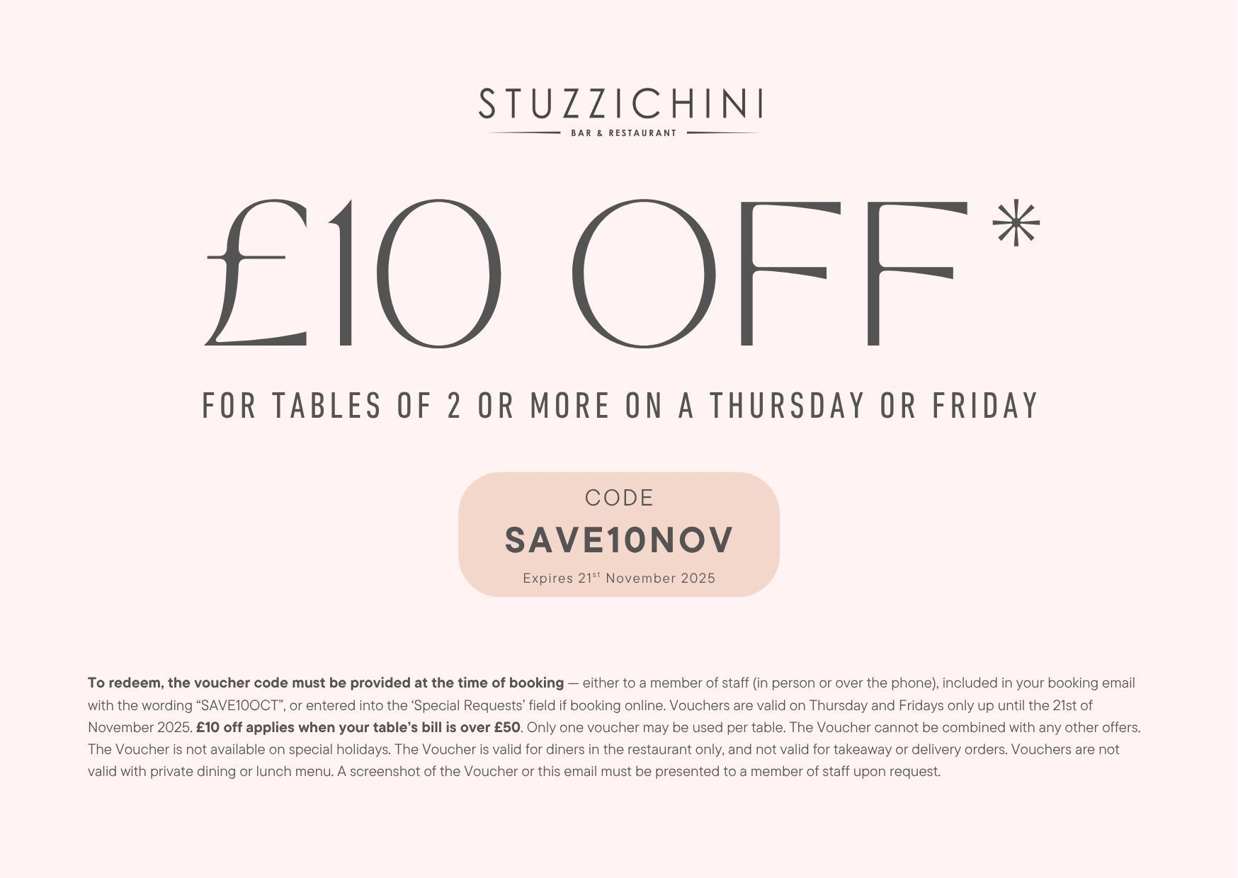 To redeem, the voucher code must be provided at the time of booking — either to a member of staff (in person or over the phone), included in your booking email with the wording “SAVE25OCT” / “SAVE10OCT”, or entered into the ‘Special Requests’ field if booking online. Vouchers are valid on Thursday and Fridays only up until the 21st of November 2025, this means that you must book and dine with us before the 21st November. £25 off applies when your table of four’s bill is over £100 and £10 off applies when your table of two’s bill is over £50. Only one voucher may be used per table. The Voucher cannot be combined with any other offers. The Voucher is not available on special holidays. The Voucher is valid for diners in the restaurant only, and not valid for takeaway or delivery orders. Vouchers are not valid with private dining or lunch menu. A screenshot of the Voucher or this email must be presented to a member of staff upon request.